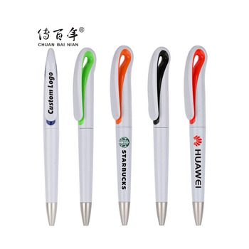 Yüksek kalite özel Logo yönetici kalem benzersiz şekli beyaz büküm tükenmez kalem promosyon plastik